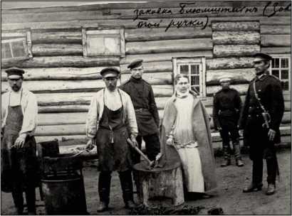 Ее ставили около наковальни, тут же расставляли кузнецов с молотами, надзирателей, — и местный фотограф снимал якобы сцену заковывания «Золотой ручки».