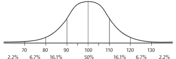 Рисунок 19. Кривая нормального распределения IQ, где 50% попадают между 90 и 110