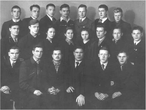 49. Академическая группа А-828. Сидят слева направо: Б. Щербаков, И. Дашкова, 3. Сухинина, Е. Козловская, Л. Костромина, М. Богданов; стоят: А. Алексеев, Н. Масленников, В. Кудрявцев, Р. Гордеев, А. Шувалов, В. Яковлев, В. Басалаев, А. Чубаров, В. Плугин, Е. Матюшин.