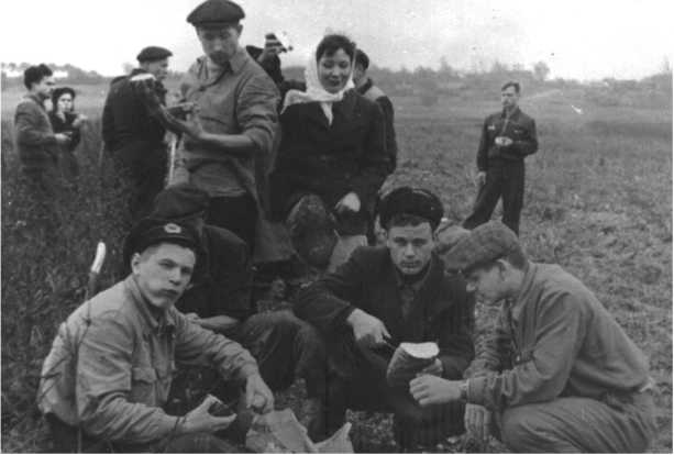 37. Уборка овощей. Б. Спицин, В. Мельников, Г. Махоня, Б. Щербаков, В. Гуркин на полях совхоза «Победа».