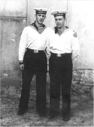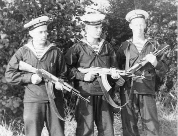 42. Молодые краснофлотцы Б. Щербаков, О. Мамалыга, Е. Фадеев на кронштадском полигоне.