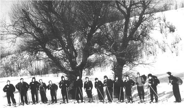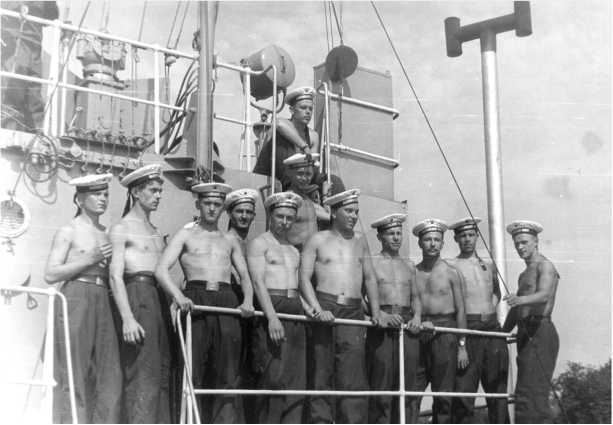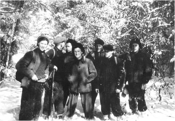 43. На кратком привале. Внизу А. Демехин, В. Бабич, А. Равдин, Э. Бодров, И. Мазаное. Вверху Н. Соколов, Б. Щербаков, О. Мамалыга, мичман А. Готовко, Е. Репинский.