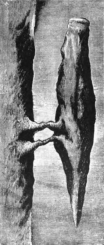 Следующий грот представляет весьма неправильный пол как бы с огромными ступенями, почему самый грот назван театром. Надо заметить, что тут вообще каждое место, каждое сколько-нибудь оригинальное образование получило свое название или в память открывателей, братьев Кампбель, или других лиц, или всего чаще по сходству с каким-нибудь предметом. За театром, вдоль стены снова выделяется множество сталактитов — это ботанический сад; действительно, отдельные колонки и сосульки очень перепутаны и при некотором напряжении фантазии могут напомнить стволы деревьев и кустов. Далее мы вышли в обширный грот, называемый Elfin Ramble (прогулка духов). Он имеет 500 футов длины, 300 футов ширины и различную высоту от 3-х до 20-ти футов. Потолок, или свод, грота представляет множество висящих сталактитов самой причудливой и разнообразной формы, пол же его почти совершенно ровный. При самом входе расположена красивая арка, фантастически перекинутая с одной стороны на другую; она называется натуральным мостом и, очевидно, представляет часть твердой известковой породы, не размытой продолжительным действием воды. На краю грота имеется обширная впадина, весьма значительной глубины, называемая пропастью Плутона. Подле неё небольшое углубление, постоянно наполненное чистою прозрачною водою, — это хрустальный ключ (Cristal spring). Тут лежит кружка, и каждый может испить воды, весьма приятной на вкус. Прозрачность воды такова, что на первый взгляд кажется, будто углубление совершенно пусто, и надо опустят туда руку, чтобы убедиться, что оно действительно наполнено до краев водою. Осветив издали пропасть Плутона, проводник обратил наше внимание на выделяющуюся на темном фоне стены белую фигуру из выпуклых сталактитов, напоминающую человека, окутанного простынею. Эта фигура названа привидением и пугает иногда нервных дам. Наконец на самом краю грота, мы увидели несколько настоящих человеческих костей. Когда они были впервые открыты и было доказано, что это действительно не камни, везде тут валяющиеся, а кости, и притом человеческие, то явилось несколько предположений о том, откуда они взялись? Одни полагали, что это кости случайно попавшего сюда индейца, другие придавали появлению костей романический оттенок, будто это кости прекрасной индианки, спустившейся в пещеру вследствие неразделенной любви и погибшей затем от недостатка пищи. Какой-то старый солдат конфедератской армии, несколько лет тому назад посетивший пещеру, высказал предположение, что это кости его товарища! Он уверял, что во время стоянки его отряда под Шефердстауном (более 100 верст отсюда) его товарищ открыл какую-то небольшую пещеру и, спустившись в нее в другой раз, уже более не возвращался. Быть может, это был просто предлог для побега из армии, что случалось тогда довольно часто. Но старый ветеран убежден, что его товарищ заблудился, затем разными подземными ходами проник, вероятно, наконец сюда, и здесь, уже в нескольких шагах от выхода на свет Божий, погиб от голода и истощения сил. Ученые исследователи пришли однако к заключению, что эти кости принадлежат человеку доисторическому, каменного века. Впрочем, что пещера посещалась людьми и прежде — можно заключить по недавно найденным куску древесного угля и ясно отпечатанному на мягкой глине следу человеческой ступни.