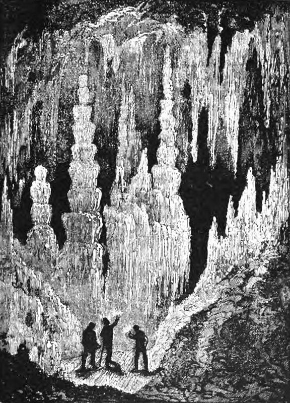 Итак, вооружившись свечами, мы начали спускаться по узкой, но хорошо устроенной лестнице. Глубина этого первого спуска не велика, саженей 5, но отдельные ходы пещеры лежат на глубине 40 саженей (абсолютная высота долины около 115 саженей). Тотчас по выходе из спусковой галереи, мы очутились в обширном гроте, называемом Сени (Entrance), среди которых находится огромный сталагмит в виде колонны в 20 футов в диаметре и более 30 футов высоты; этот сталагмит назван колонною Вашингтона. Кругом и по стенам грота висит множество красивых сталактитов, между которыми кое-где выделяются блестящие кристаллы кварца. Колонна изборождена желобками и имеет оригинальный желтовато-красный цвет, происходящий, вероятно, от примеси окиси железа. Затем мы двинулись по длинному и извилистому ходу, соединяющему первый грот со следующим. В этом проходе замечательно место, называемое фиш-маркет — пространство на стене, покрытое множеством больших и малых сталактитов, напоминающих своим наружным видом рыб, развешенных для продажи. По этим сталактитам медленно струится вода, так что они всегда мокры и при своей разнообразной окраске действительно напоминают рыб с темными спинками и беленькими брюшками. Длина «рыб» не более 2-х футов, но они очень красивы и приковывают внимание проходящих.