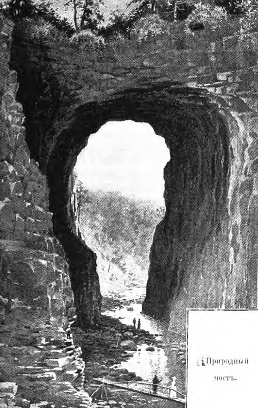 Место, где находится Природный мост, представляет теперь притягательный пункт для многих туристов, но, помимо того, оно отличается здоровым горным климатом, и сюда ездят и просто пожить, как на дачу. Поэтому и здешняя гостиница устроена без лишних затей и отличается патриархальною простотою. После ленча я отправился бродить по окрестностям без всяких проводников, так как в самой гостинице мне объявили, что они не нужны. Кругом холмы, покрытые лесами, сохранившимися еще в девственном состояния. Сперва я пошел вдоль извилистой дорожки, которая беспрерывно перебегает с одного берега протекающей тут речки на другой; каждый раз через речку построены простенькие деревянные мостики. Но вот долина делается всё уже и уже, дорожка обратилась в еле заметную тропинку, но моста, о котором мне столько говорили, всё еще нет. Попадались скамейки, маленькие пещеры в обрывах скал, но это всё не то.