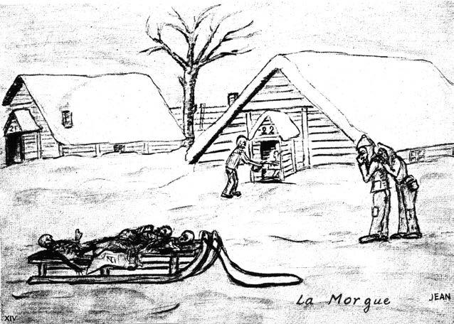 За зиму санитарные условия в лагере серьёзно ухудшились, и ежедневная смертность значительно увеличилась. Каждое утро сани, что-то вроде волокуш, которые когда-то использовали наши лесники, останавливались перед лазаретами или тем или другим бараком. Два-три человека из похоронной команды выносили из бараков раздетые трупы, на которых чёрным были написаны имя и порядковый номер, складывали их на сани, как брёвна, чтобы отвезти их в 22-й, в морг. Тела отвезли в лес, чтобы похоронить в общей могиле, только после того, как растаял снег.
