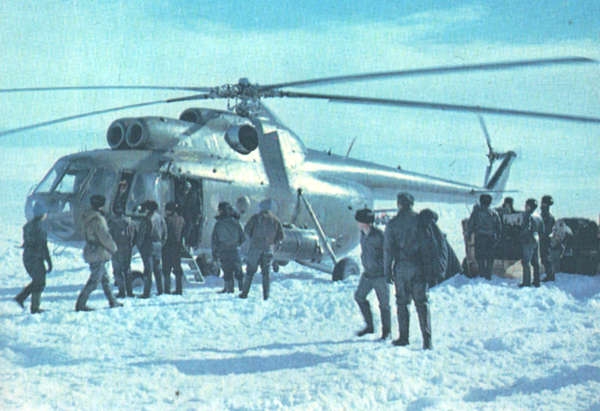 Наше судно стояло рядом с «Сомовым» у кромки припая, почти в сотне километров от Молодежной. Дальше не пускал мощный береговой лед. На разгрузке круглосуточно работала пара «Аннушек» и два мощных турбовинтовых вертолета Ми-8, забиравших в один рейс до четырех тонн груза. Негабаритные огромные контейнеры и ящики они таскали целиком на подвеске. Раньше подобные грузы возили на станцию тягачами на санях; то был долгий и рискованный путь по протаивающему морскому льду.