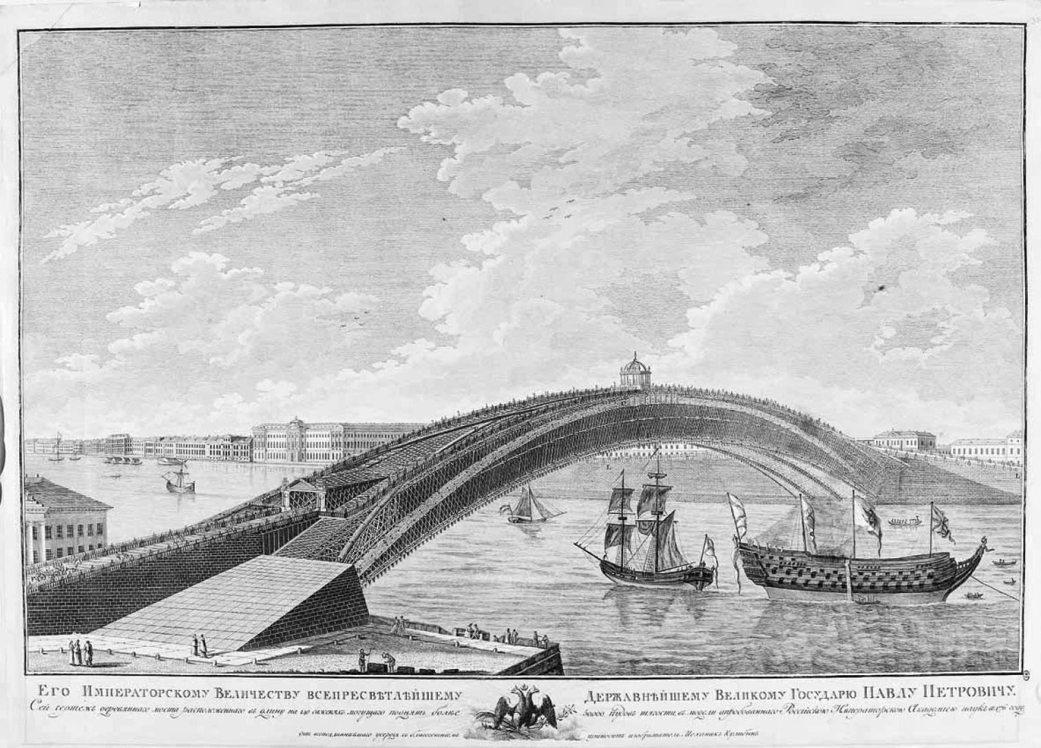 В 1772 г. в «С.-Петербургских Ведомостях» появилось сообщение: «Лондонская академия назначила дать знатное награждение тому, кто сделает лучшую модель такого моста, который бы состоял из одной дуги или свода, без свай и был бы утвержден своими концами только на берегах реки». Прочитав это сообщение, Кулибин загорелся. Он ведь и сам жил в здании академии на Васильевском острове, испытывая неудобства от отсутствия постоянного моста через Неву. Большая глубина и сильное течение казались современникам Кулибина непреодолимыми препятствиями, горожане были вынуждены обходиться наплавным временным мостом на барках. Весной и осенью во время вскрытия и замерзания реки этот мост разбирали, сообщение между частями города прекращалось. Чтобы облегчить жизнь петербуржцев, а вовсе не из-за обещанной англичанами награды Кулибин и приступил к решению сложной задачи. Он надумал перекрыть реку одним пролетом арочного моста, опирающегося концами на разные берега реки.