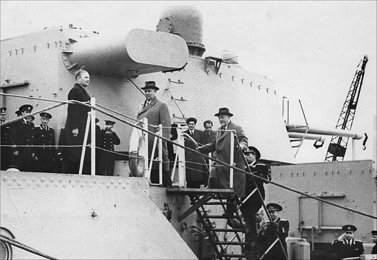 Н.С. Хрущев и Председатель Совета Министров СССР Н.А. Булганин в Калининграде поднимаются на борт крейсера «Орджоникидзе»