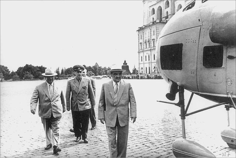 Н.С. Хрущев, Е.Ф. Логинов и А.И. Микоян в Кремле осматривают вертолет М.Л. Миля, переоборудованный в пассажирский по образцу американского, полученного от Д. Эйзенхауера