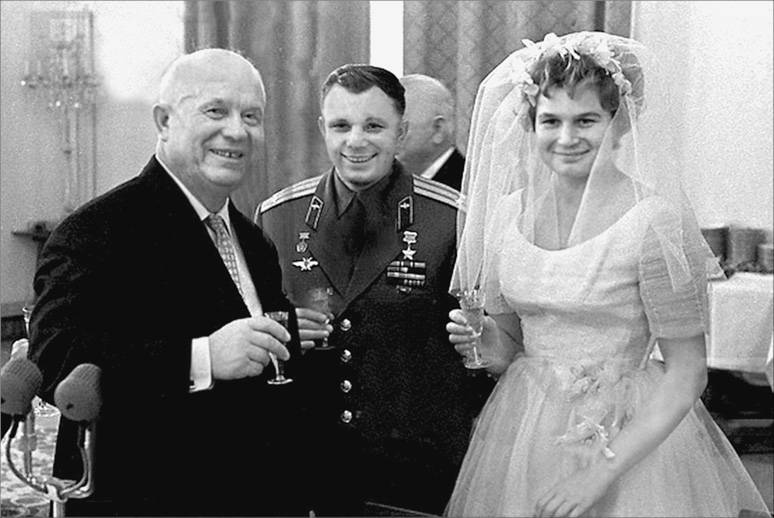 Н.С. Хрущев и Ю.А. Гагарин поздравляют В.В. Терешкову в день ее свадьбы с космонавтом А.Г. Николаевым