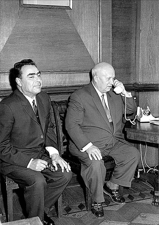 Л.И. Брежнев и Н.С. Хрущев во время сеанса связи с космонавтами