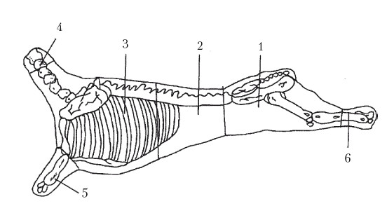 Схема разрубки бараньей туши на отруба. Первый сорт: 1 – тазобедренный; 2 – поясничный; 3 – лопаточно-спинной (включая грудинку и шею); второй сорт: 4 – зарез, 5 – предплечье, 6 – голяшка