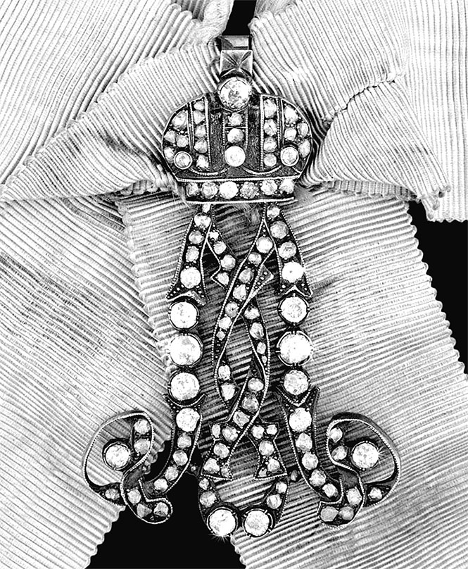 Фрейлинский шифр – при российском императорском дворе золотой, усыпанный бриллиантами знак отличия, который носили придворные дамы в должности фрейлин. Представлял собой брошь в виде одного инициала (монограммы) императрицы; или же двух сплетенных инициалов императрицы и ее свекрови – вдовствующей императрицы (такой знак назывался «двойной»). На фотографии изображен шифр, который использовался в годы правления российской императрицы, жены Александра II Марии Александровны