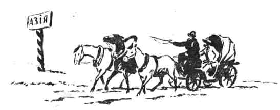 До Москвы он доехал по железной дороге и далее до Нижнего Новгорода (теперь город Горький)— по шоссе. Там он купил тарантас казанской работы и отправился в путь по Большому сибирскому тракту. У Екатеринбурга (теперь Свердловск) Уральский хребет можно переехать почти незаметно. «Только верстовой столб с надписью с одной стороны «Европа», а с другой — «Азия» наивно, хотя наглядно, изображал искусственную границу обеих частей света».