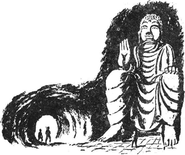 В пещерах находятся изображения Будды и буддийских божков. Одно из изображений Будды имеет в высоту свыше двадцати пяти метров; длина ступни около шести метров. В другой пещере есть громадный идол, окруженный своими детьми, числом 72; голова этого идола, кисти рук и ноги позолочены. Все идолы, как большие, так и малые, сделаны из глины с примесью тростника. В некоторых пещерах висят большие чугунные колокола.