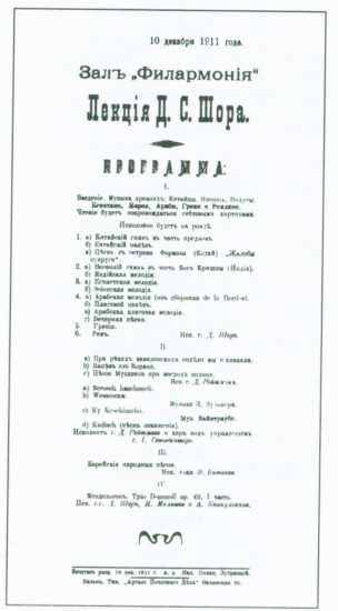 Программа лекции — концерта Шора, 1911 г. В программе также еврейские народные песни и трио D-moll Мендельсона.