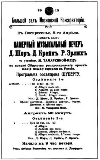 Программа концерта «Московского трио» в пользу Общества распространения просвещения между евреями в России, 1912 г.