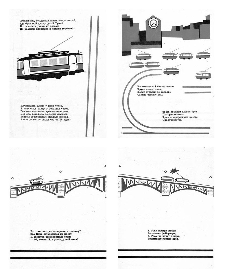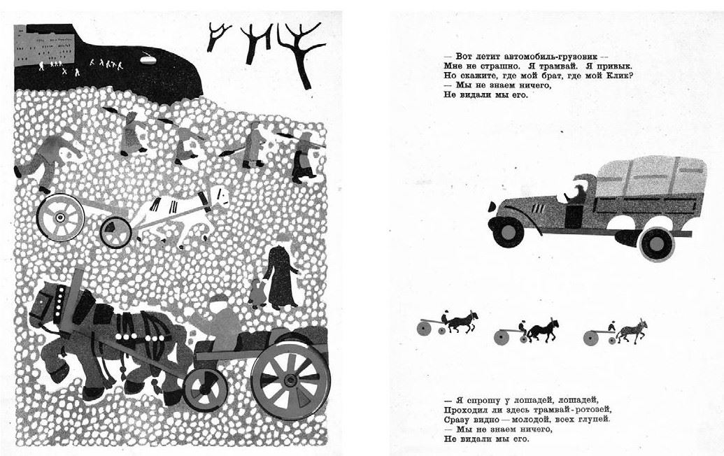 Однако композиция, элементы сюжета, сама структура ее, исполненная веселого и бодрого ритма, во всем следуют фольклорной традиции. В терминологии Проппа, это типичная сказка, в зачине которой есть некая недостача, потеря или вредительство, а в концовке – ликвидация беды (потери, вредительства) и благополучное возвращение героя домой[140]. Один из персонажей, трамвай по имени Трам, отправляется на поиски пропавшего друга, тоже трамвая, которого зовут Клик; он обращается к встречающимся на его пути городским обитателям, но те не помогают ему; наконец, он встречает автомобиль, который сообщает ему, где надо искать пропавшего друга. Найдя Клика, Трам собирается оттащить его на буксире домой. На первый взгляд, простенькая, незатейливая история с вполне предсказуемой композицией, не выходящей за рамки классической сказочной конструкции, типичной и для произведений детской литературы вообще.