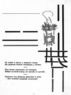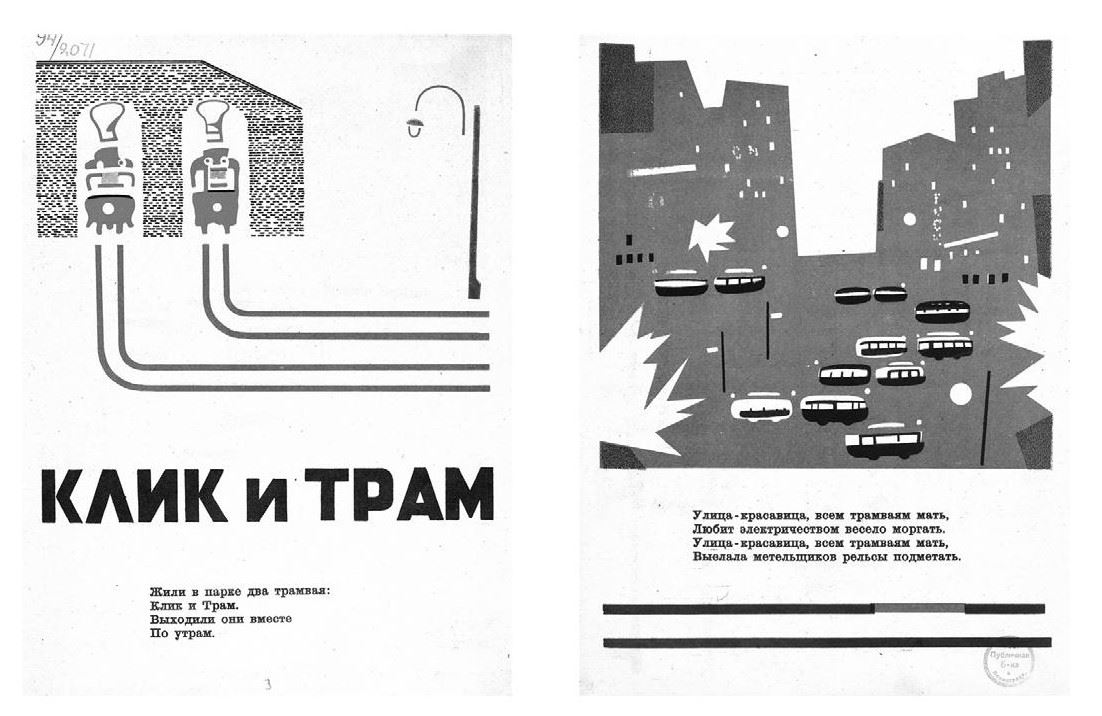 В этой статье я намереваюсь проанализировать структуру «эзопова языка» русской детской литературы с его сложными уровнями утонченных иносказаний на примере одного малоизвестного артефакта того периода, а именно сочиненной Осипом Мандельштамом детской книжки с картинками под названием «Два трамвая»: Клик и Трам»[126]. «Эзопова» амбивалентность этой книжки советской эпохи проявляется прежде всего в особой художественной манере, в какой она подается разным категориям читателей: детям, взрослым читателям и наконец самому цензору. Для детей существует один уровень текста, он звучит совершенно безобидно, разве что в интонации присутствует некий надлом, указывающий на существование в тексте иных смыслов, глубин и подводных камней. Но стоит заглянуть поглубже в это зияние, и перед нами предстает куда более драматичная, чем кажется на первый взгляд, картина реальности, правдиво изображать которую руками цензуры всячески препятствует существующий политический режим. Я утверждаю, что благодаря использованию приемов «эзопова языка» эта уникальная книжка содержит контекстуальные, интертекстуальные и подтекстовые глубины, в огромной степени обогащающие систему ее смыслов и предоставляющие искушенному читателю возможность насладиться изысканностью произведения, на поверхностный взгляд представляющего собой обыкновенную детскую книжку с картинками. Структура книги сложна и многогранна, в ней одновременно присутствует несколько уровней: цензор и ребенок должны увидеть только один из них, самый поверхностный: простую историю, рассказанную в стихах, и со счастливым концом[127]; но речь автора обращена ко взрослому, думающему читателю, умеющему пробиться сквозь уровень, предназначенный для ребенка, к иным смыслам, искусно укрытым завесой «эзопова языка»; здесь автор ведет серьезный разговор с читателем о мрачных сторонах политической и психологической ситуации в стране.