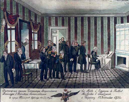 Эта поездка, начало которой было идиллическим (супруги провели спокойный романтический месяц в доме, подготовленном для них архитектором Шарлеманем), закончилась катастрофой. В октябре 1825 г. Александр по приглашению новороссийского генерал-губернатора графа М. С. Воронцова посетил Крым, откуда вернулся в Таганрог сильно простуженным. С каждым днем он чувствовал себя все хуже, но при этом далеко не всегда выполнял назначения врачей. Императору был поставлен диагноз: желудочно-желчная лихорадка. 19 ноября 1825 г. Александр I скончался.