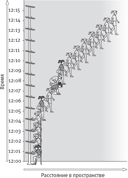 Сначала, в 12.00, Кейтлин изображена в классе за партой. Она сидит спокойно, перемещаясь только во времени, но не в пространстве. На рисунке разворачивается короткая цепочка Кейтлин, перемещающихся во времени. В 12.05 звенит звонок. Кейтлин направляется в столовую. Ее парта продолжает перемещаться во времени, оставаясь неподвижной в пространстве, Кейтлин же теперь двигается и во времени, и в пространстве. В 12.07 она останавливается завязать шнурок. Минуту она движется во времени, но не в пространстве. В 12.08 она возобновляет движение по направлению к столовой и теперь шагает чуть быстрее, а то, пока дойдет, все расхватают. В 12.15 она входит в столовую. Мы проследили “мировую линию” Кейтлин, как выразился бы физик.