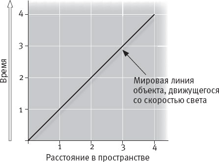 Эта диаграмма пространства-времени – всего лишь набросок. Составляя настоящую диаграмму пространства-времени, физики используют специальную единицу, объединяющую время и пространство, например, метр времени. (Метр времени – это очень малая доля секунды, меньше миллиардной доли, – время, за которое фотон, движущийся со скоростью света, проходит один метр.) На такой диаграмме объект, проходящий четыре метра пространства за четыре метра времени, будет представлен линией, проходящей под углом в 45 градусов к осям. Это график движения со скоростью света – например, фотона (рис. 10.2).