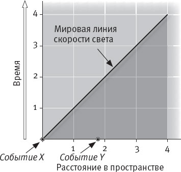 Рис. 10.4. График пространства-времени представляет два одновременных события (X и Y), которые происходят на некотором расстоянии друг от друга в пространстве. В тот момент, когда эти события происходят, они не знают друг о друге, потому что узнать друг о друге в тот же момент они могли бы, только если бы информация распространялась быстрее, чем со скоростью света, то есть ее мировая линия проходила бы под углом больше 45 градусов, а это в нашей вселенной не допускается.