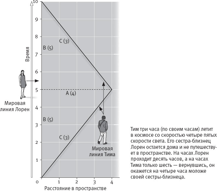 Теперь представим себе, что наш объект – человек и на руке у него часы. Часы покажут эту длину (три метра времени) как “время”. На рисунке 10.6 Лорен остается неподвижна в пространстве, пока ее часы отсчитывают пять часов. Ее брат-близнец Тим движется со скоростью четыре пятых скорости света, и для него, пока у Лорен проходит пять часов, проходит всего три часа. Тим разворачивается и возвращается, вновь отсчитав три часа, пока Лорен отсчитывает пять. Теперь, когда они встретятся, Тим окажется чуть-чуть моложе своей сестры-близнеца. Это один из замечательных парадоксов вселенной, которым научил нас Эйнштейн.
