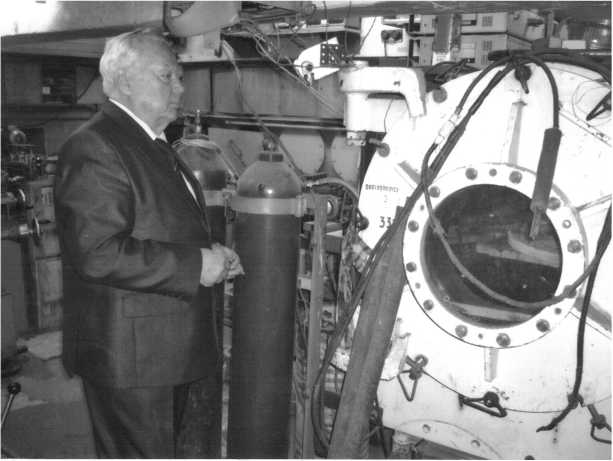 80. Б. Щербаков у вакуумной камеры для исследования воздействия газовых струй ракетных двигателей на космические объекты.