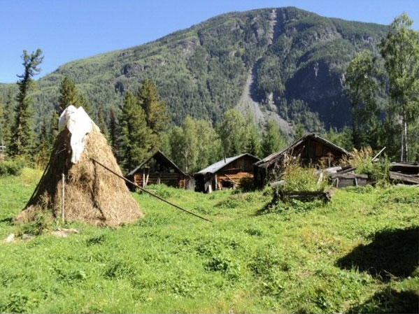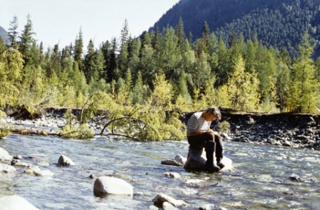 …Углубляясь в лес, неожиданно выходим к подножию обвальной горы, которую так хорошо видно от избы Агафьи и которая обвалилась в год рождения Агаши в 1944 году. Огромные глыбы и небольшие камни вплотную надвинулись на кедрач. Местами камни окрашены в охряный цвет, больше с боков и внешней поверхности. Очевидно в камнях значительное содержание железа, которое при окислении от воды и солнца придает глыбам такую окраску. Камни как бы специально окрашены яркой краской. Одна такая огромная охряная глыба видна даже от избы Агафьи. Я раньше все не мог понять, кто же это так раскрасил скалу (рассматривал даже в бинокль). Искореженные при обвале скалы кедры-великаны до сих пор торчат из-под нижних крайних камней и глыб. Как будто их черные руки взывают к небу.