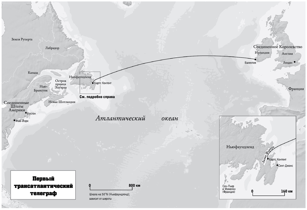 Сайрус не мог взять в толк, отчего его брат и новый знакомый так взбудоражены. Он почти ничего не знал о Восточной Канаде, кроме того, что та до сих пор была под контролем Британии, и не видел никакой выгоды в трудной и дорогой прокладке кабеля ради экономии пары дней на доставку почты. Филд выпроводил Джисборна и пошел взглянуть на карту мира, чтобы найти на ней этот Ньюфаундленд. Ему бросилось в глаза, что остров действительно был гораздо ближе к Европе, чем Нью-Йорк. Тогда он задумался, возможно ли соединить телеграфом не только США с Ньюфаундлендом, но и Ньюфаундленд с Ирландией, проведя трансатлантическую связь, о которой Джисборн едва обмолвился. Трансатлантический кабель вполне мог сократить коммуникационный разрыв между Европой и Америкой от нескольких недель до нескольких секунд. А об этом уже стоило поразмыслить.