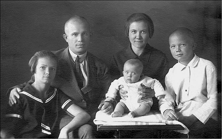 Н.С. Хрущев с детьми от первого брака с Ефросиньей Ивановной Писаревой, умершей от тифа в 1918 г., Юлей (1916 г.р.) и Леней (1917 г.р.) и Н.П. Кухарчук с дочерью Радой (1929 г.р.). Киев, 1929 г.