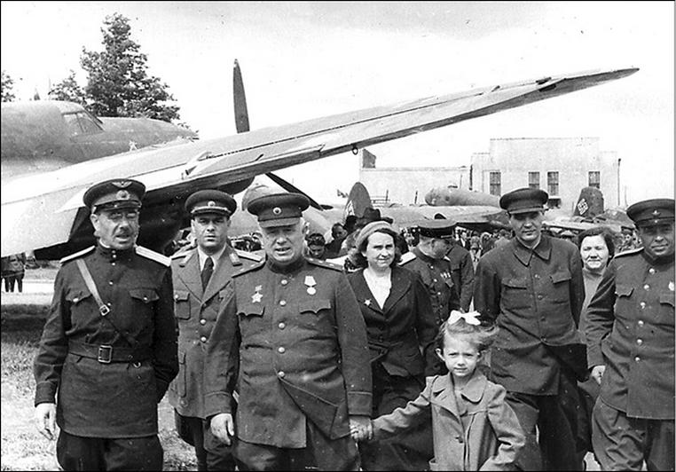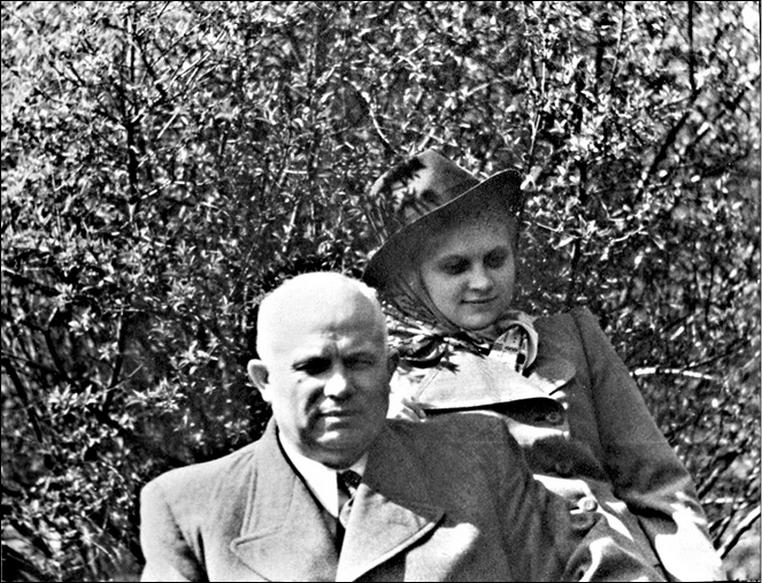 Н.С. Хрущев и дочь Елена на выставке трофейного оружия в Москве в парке им. М. Горького (сзади справа: М.С. Гречуха, Нина Петровна, капитан В.М. Божко – офицер охраны Хрущева). 1943 г.