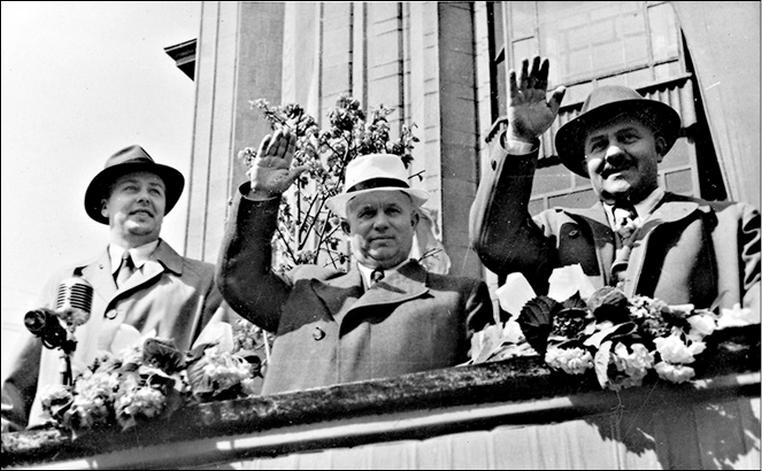 На трибуне секретарь ЦК КП(б)У Патоличев, председатель Совета Министров УССР Н.С. Хрущев, первый секретарь ЦК КП(б)У Л.М. Каганович. 1 мая 1947 г.