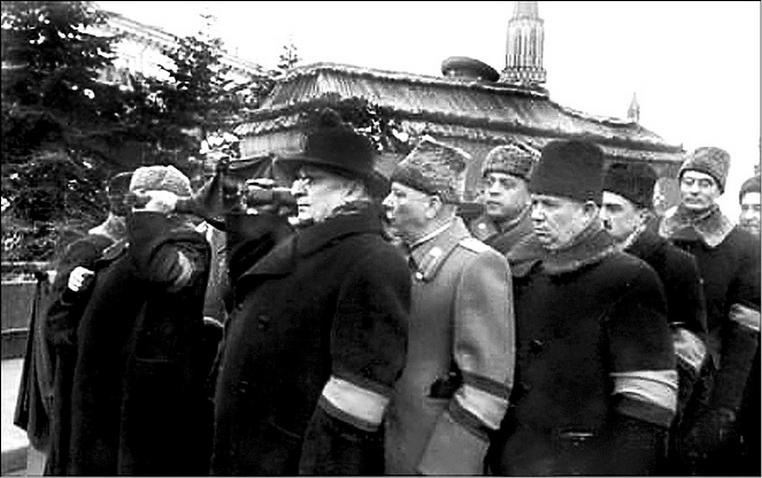 Гроб с телом И.В. Сталина направляется к Мавзолею на Красной площади в Москве. Сопровождающие: Л.П. Берия, К.Е. Ворошилов, Н.С. Хрущев, А.И. Микоян, М.А. Суслов. Март 1953 г.
