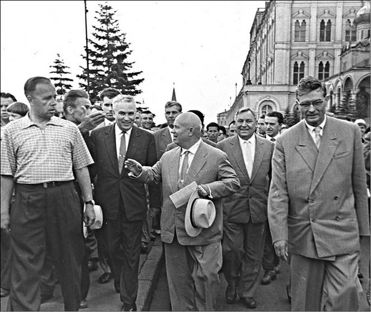 В 1954 г. Кремль открыли для свободного посещения. В толпе посетителей: Ф.Р. Козлов, Н.С. Хрущев, Н.Г. Игнатов, М.А. Суслов летом 1958 г.