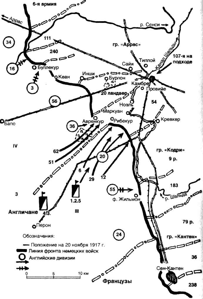 И больше ничего. Это было гораздо меньше того, сколько требовалось для осуществления крупного прорыва, даже если бы англичане умудрились добиться внезапности, а немцам нечего было бы им противопоставить, кроме потрепанных дивизий. И наконец, англичане не имели необходимых резервов. Если говорить о масштабе наступления, план предусматривал прорыв при поддержке танков на участке двух корпусов между Гоннелье и Авренкуром; в открывшуюся брешь должна была прорваться кавалерия и развить успех. Англичане, очевидно, намеревались взять Камбре, но точно неизвестно, были ли у них более глобальные цели.