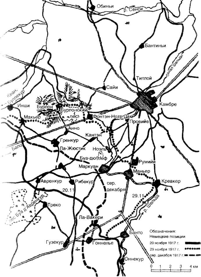 В ноябре 1917 года немецкую армию на этом спокойном отрезке линии фронта представляла армейская группа Кодри, которая находилась под командованием XIII корпуса. 20-я дивизия ландвера[5] была размещена по обе стороны дороги Камбре — Бапо; 54-я егерская дивизия занимала участок протяженностью 8 километров между Авренкуром и Ла-Вакери; с юга к ней примыкала 9-я дивизия резерва. Плечом к плечу с ней выстроились три пехотных полка 54-й егерской дивизии; по два батальона от каждого поочередно находились на передовой, а третий отдыхал. Только первая позиция была укомплектована, промежуточная позиция пустовала.