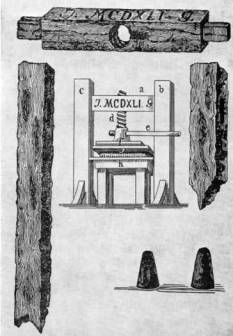 Реконструировали стан, не задумываясь над смыслом его работы. Но дело даже не в этом. В XV в, число 400 писали римскими цифрами не так, как это делается теперь — CD, а таким образом: СССС. Да и имя Иоганн начиналось не с буквы J, а с I. В 1441 г. Гутенберг был не в Майнце, а в Страсбурге. Это сразу насторожило майнцских патриотов. Получалось, что книгопечатание вообще и типографский стан в частности изобретены не в Майпце. Предполагать, что Гутенберг привез с собой станок из Страсбурга, наивно. Столь несложную конструкцию он мог соорудить и вторично.