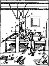 Познакомиться со всеми этими устройствами можно по старейшим изображениям типографского стана. Первое из них встречается на уже знакомой нам гравюре, помещенной в 1500 г. в издании Маттиаса Гусса. Со времени изобретения книгопечатания прошло всего 50 лет. Нет никакого сомнения в том, что такой же стан стоял в типографии Гутенберга. На гравюре видно массивное сооружение, вертикальные стойки которого укреплены распорками, упирающимися в потолок. Винт пресса не охватишь ладонями, он, видимо, сделан из дерева. Наборная форма заключена в каретке, которая закрыта и подведена под нажимную плиту. На столе хорошо просматривается П-образная стойка для поддержки деталей каретки в открытом состоянии.