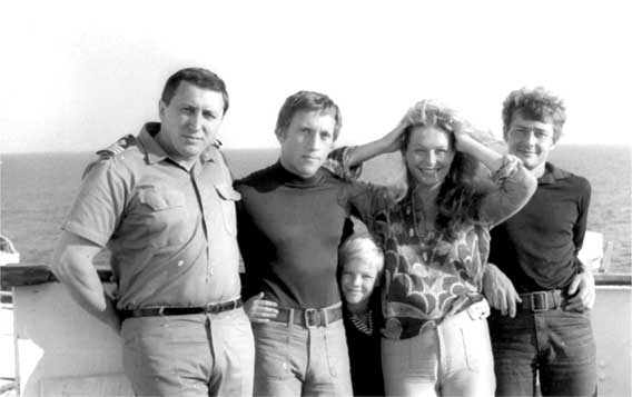 На теплоходе «Шота Руставели». Слева направо: помощник капитана Владимир Борцов, Владимир Высоцкий, Марина Влади с сыном Володей, Всеволод Абдулов. Пицунда. Август 1973 г.