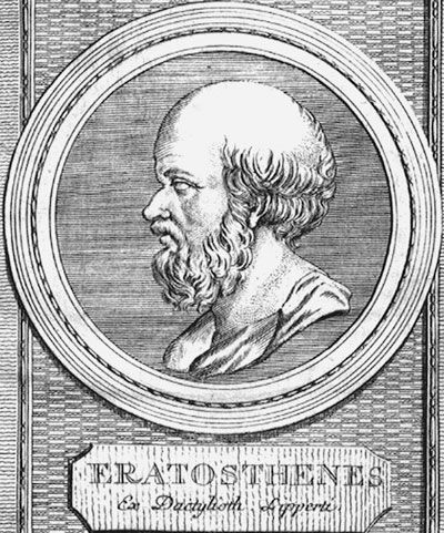 Эратосфен (ок. 275–194 г. до н. э.) – греческий энциклопедист, проявивший себя в разных областях знаний. Родился в Кирене, получил образование в Афинах. Царь Птолемей III Эверет вызвал его в Александрию, где назначил заведующим крупнейшей в мире библиотекой.