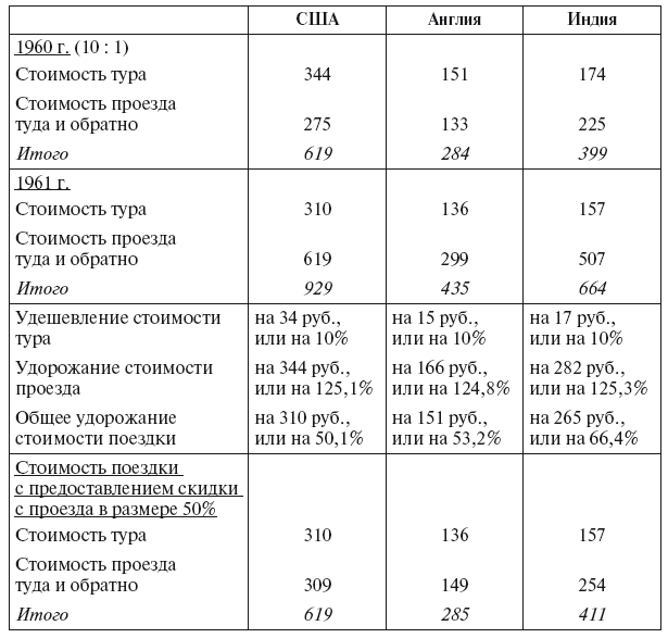 Как видно из таблицы, ценовая политика в отношении выездного туризма в США в принципе мало чем отличалась от аналогичной политики в отношении Великобритании и Индии. Более того, тур в США на 1961 г. подорожал меньше, чем туры в упомянутые страны.