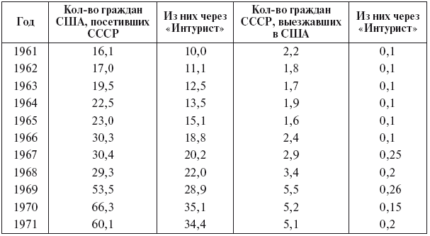 Ниже в табл. 11.2 приводятся сведения о советско-американских туристских связях за 1961–1971 гг.[823]