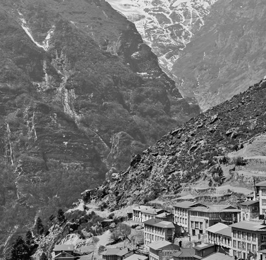 Расположенный на высоте 3450 метров над уровнем моря, Намче занимает огромный, чуть покатый и округлый участок земли, напоминающий вставленную в склон горы спутниковую тарелку. Более сотни строений, соединенных лабиринтом узких тропинок и мостиков, прилепились к скалистому склону. В районе нижней окраины города я нашел гестхаус Khumbu Lodge, поднял полог одеяла, выполнявшего функцию входной двери, и увидел своих товарищей по экспедиции, которые пили чай с лимоном за столом в углу.