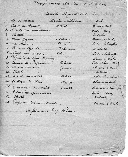 У меня перед глазами стоят полукруглые ряды ступенек, заполненные до отказа (на самом деле на концерте присутствовала всего лишь малая часть обитателей лагеря, население которого возросло до нескольких тысяч человек). В первом ряду — русское начальство лагеря в полном составе. Передо мной — мои хористы, всё ещё измученные голодом и истощённые, но в эйфории от близкой перспективы отъезда. Справа от них — оркестрик под управлением преданного и талантливого Буби Беамтера, который с балалайкой в руках одновременно аккомпанирует певцам и управляет своими музыкантами. Конферансье Эжен Сент-Эв остроумно представляет разные части программы. Кульминация концерта — финальное попурри из русских и французских народных песен, которому русское начальство аплодировало стоя.