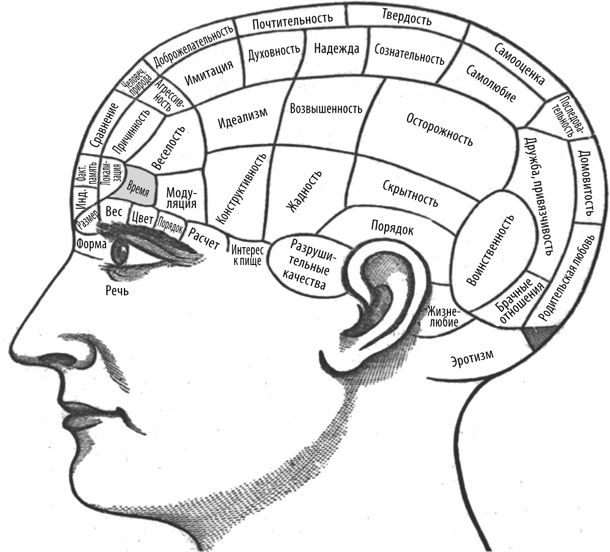Нейробиология и психология тоже эволюционировали и постепенно включили в себя проблему времени. Можно все что угодно говорить о псевдонауке френологии, но специалисты в этой области признают важность восприятия времени. Они связывают нашу способность чувствовать время с участками лобных долей, находящимися между зонами, ответственными за модуляцию и локализацию (рис. 1.1). В одном трактате по френологии говорится, что «функция этой способности заключается в регистрации течения времени, длительности и очередности событий и т. д. Она также позволяет запоминать даты, поддерживать такт в музыке и танце, а также способствует пунктуальности и выполнению принятых на себя обязанностей»9.