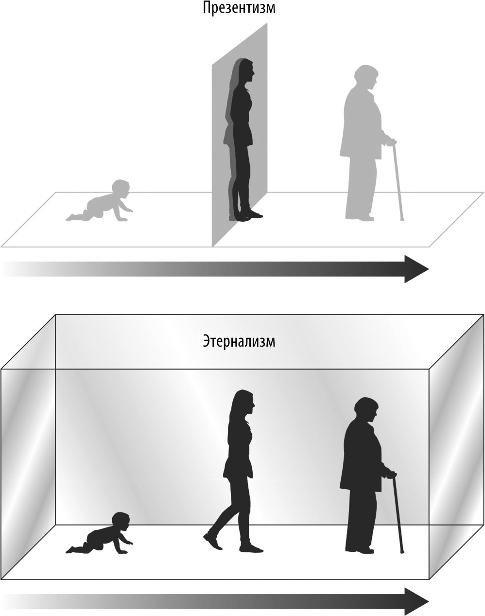 Возможно, объяснить разницу между этими двумя концепциями проще всего на примере путешествий во времени15. В рамках презентизма истинное путешествие во времени (перемещение назад и вперед, в прошлое и в будущее) невозможно. Такие технические детали, как возможность построения машины времени в рамках законов физики, просто не имеют смысла, поскольку нельзя перенестись в несуществующее время, как нельзя перенестись в несуществующее место. В рамках этернализма ось времени отчасти (но не полностью) аналогична пространственным осям, так что вселенная представляет собой четырехмерный «блок», в котором прошлое и будущее так же реальны, как север и юг по отношению к нашему местоположению в пространстве. Хотя сам этернализм не зависит от того, являются ли перемещения во времени возможными, сама постановка вопроса невозможной не является, поскольку на оси времени имеются «места» (моменты), в которые можно стремиться попасть.