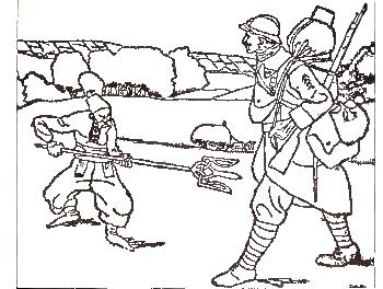 Встреча союзников на Украине. — «А ведь это те самые вилы которыми ты собирал снопы для немцев». Карикатура из газеты «Одесский листок»